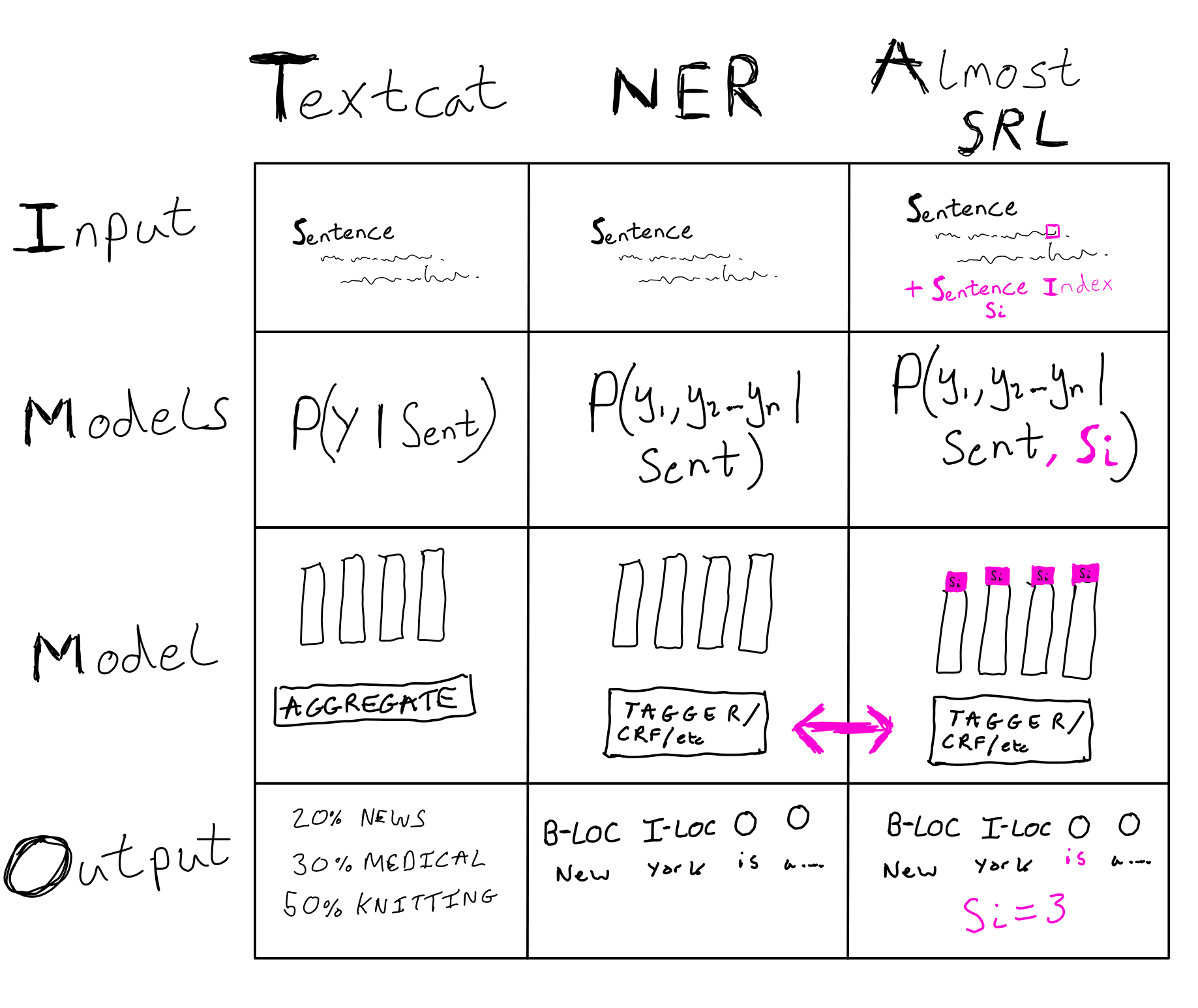 This naming will probably make lots of NLP researchers stamp their feet and tell me that I mean "close to arbitrary structured prediction", which is probably true - but we'll stick with Almost Semantic Role Labeling for the time being, given it's the most similar. It turns out that Almost Semantic Role Labeling is constrained in a particular way which makes it very easy to buid models for, which is important for practical use.